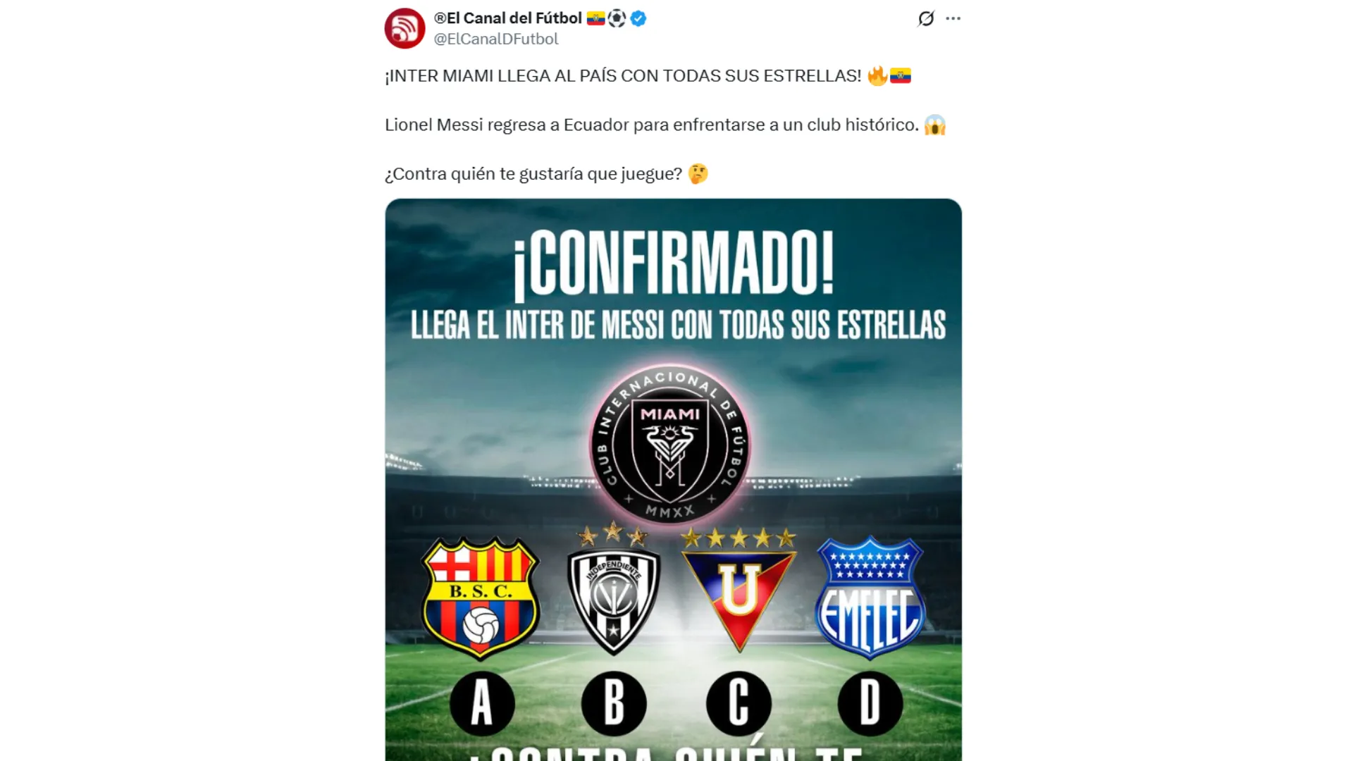 De acuerdo a la revelación de El Canal del Fútbol, Lionel Messi y el Inter Miami llegarán a Ecuador próximamente para jugar un partido amistoso. Son 4 los rivales que se perfilan para enfrentar al equipo de Estados Unidos: Barcelona SC, Emelec, Liga de Quito e IDV, son los candidatos, según adelantó ECDF.