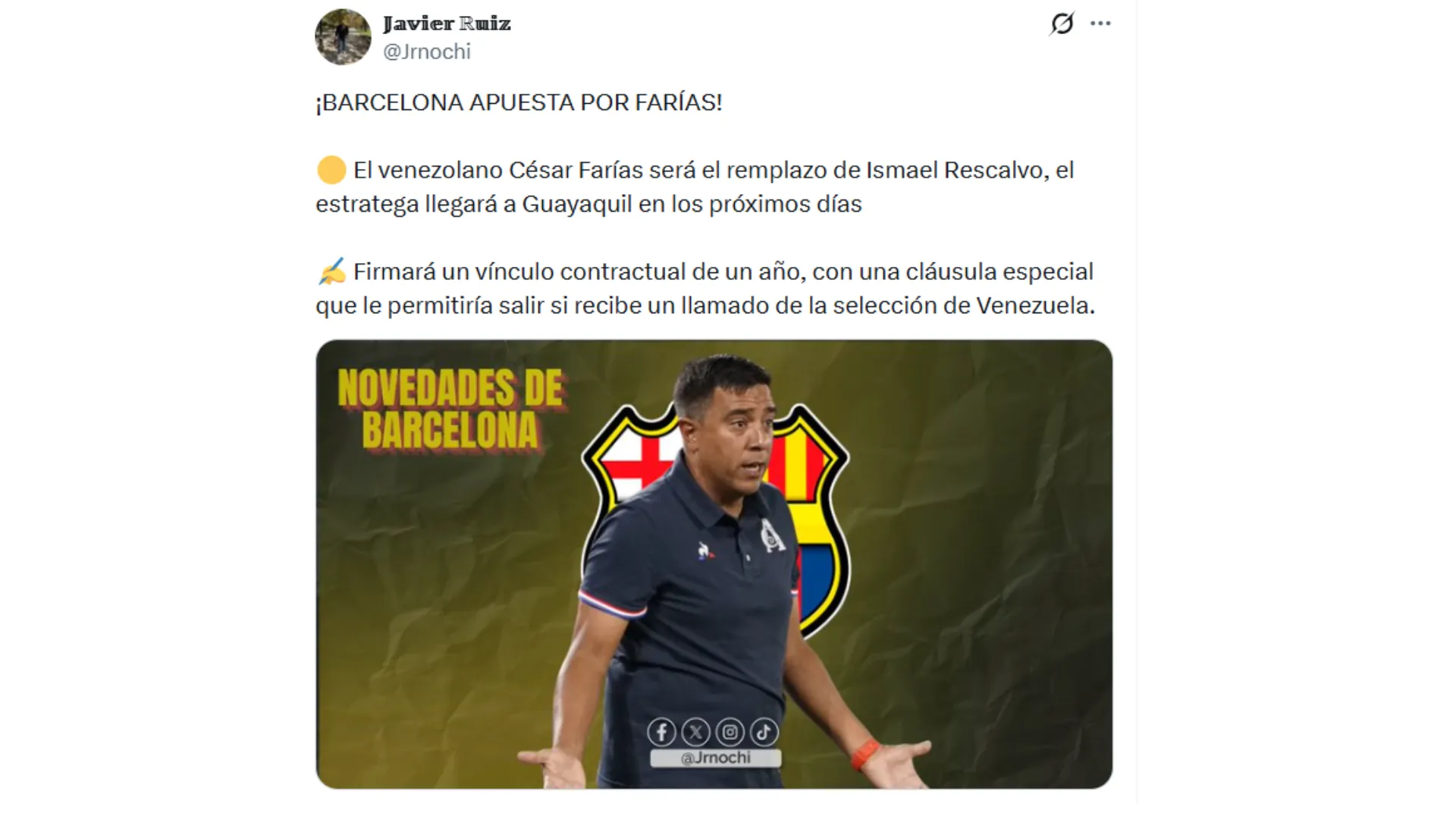 Según reveló Javier Ruiz, César Farías firmaría con Barcelona SC por una temporada, pero con una cláusula especial de salida, si llega a ser llamado en estos meses por la Selección de Venezuela para ser nuevo entrenador en el 2026, tras no clasificar al Mundial.