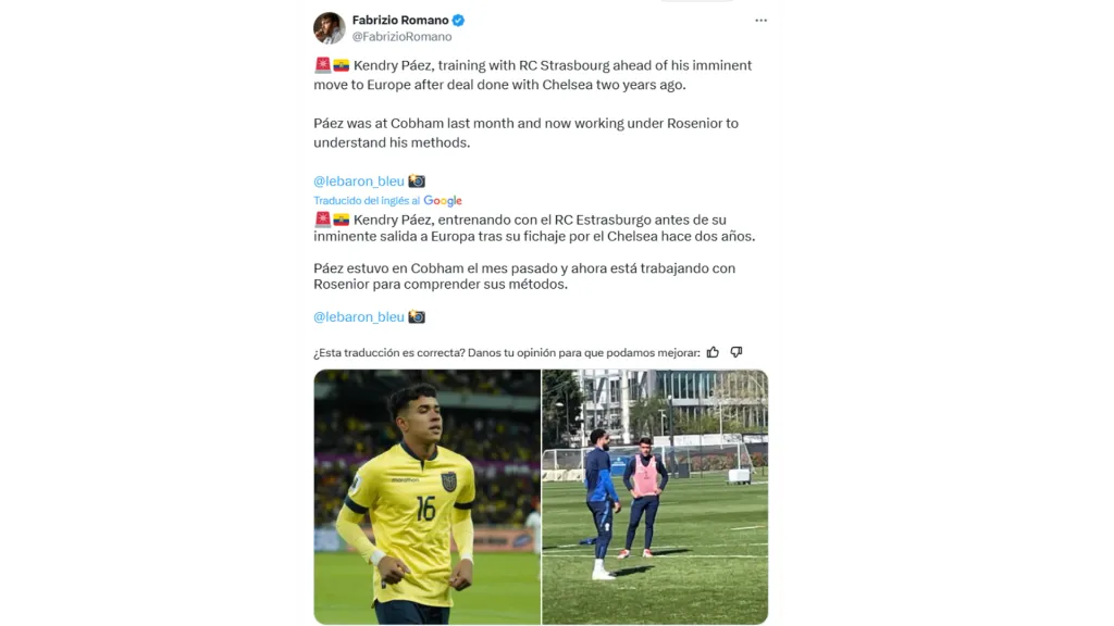 Según la revelación de Fabrizio Romano, Kendry Páez ya está entrenando con el Racing de Estrasburgo en Francia. El ecuatoriano tendría este equipo y la Liga 1 de Francia como su primera parada en el comienzo de su carrera en el fútbol de élite.
