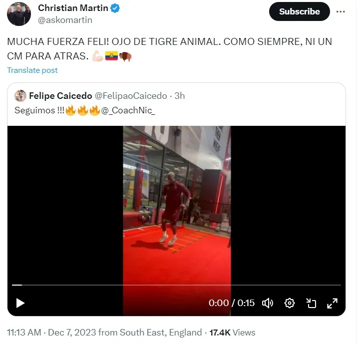 Confirmando que se refería a Felipe Caicedo luego en un video donde se ve entrenando al ex SS Lazio, RCD Espanyol entre otros colgó: “MUCHA FUERZA FELI! OJO DE TIGRE ANIMAL. COMO SIEMPRE, NI UN CM PARA ATRAS”.