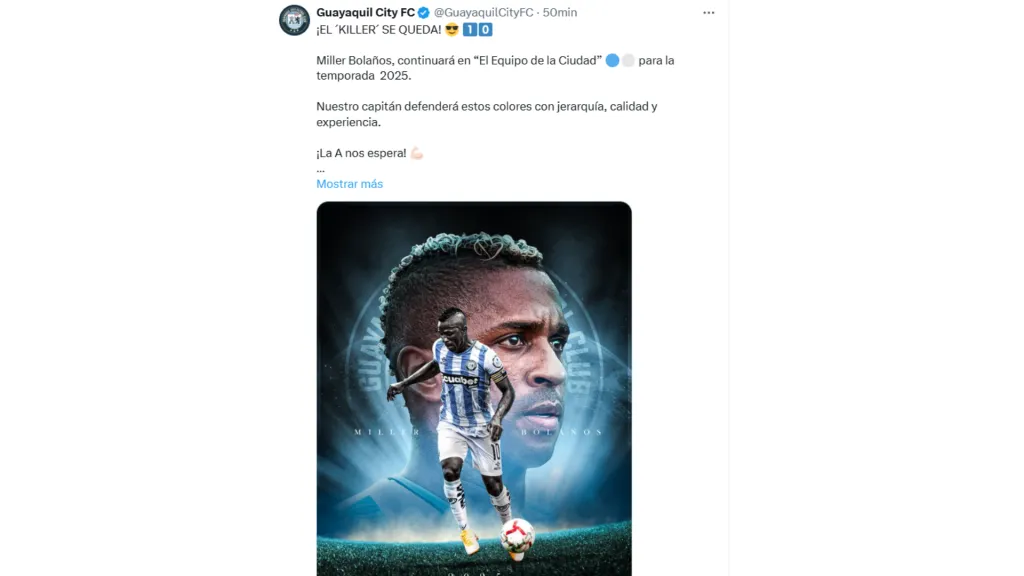 En redes sociales se hizo viral que Guayaquil City anunció como su nuevo fichaje a Miller Bolaños. El volante ecuatoriano finalmente terminó renovando su contrato, después de que hace pocas horas se especulaba con la salida del 10. El mismo club alimentó ese rumor.