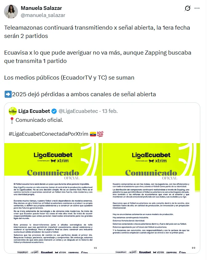 Los canales que se suman nuevamente para esta temporada son Teleamazonas y Ecuavisa. Ambos canales transmitirán en abierto. No obstante, a diferencia de 2025, solo serán 3 encuentros. De momento, se ha confirmado que 2 van por Teleamazonas y 1 por Ecuavisa.