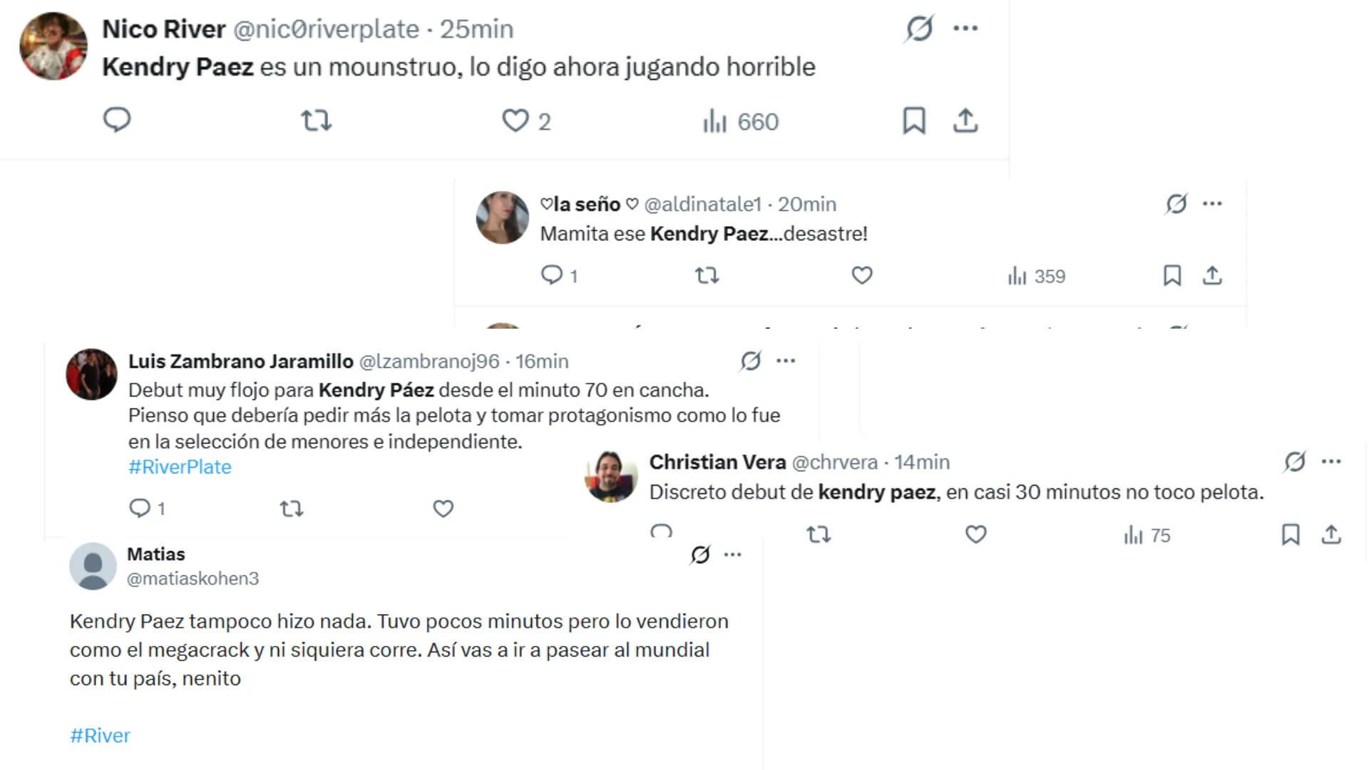 “Kendry Paez tampoco hizo nada. Tuvo pocos minutos pero lo vendieron como el megacrack y ni siquiera corre”. “Discreto debut de Kendry Páez, en casi 30 minutos no toco pelota“. “Mamita ese Kendry Paez…desastre.” “Kendry Paez es un monstruo, lo digo ahora jugando horrible”, fueron algunos de los comentarios de los aficionados.