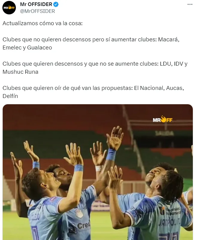 Según reveló MR. OFFSIDER en sus redes sociales, los equipos de la LigaPro que quieren que se mantenga el descenso son Liga de Quito, Independiente del Valle y Mushuc Runa.