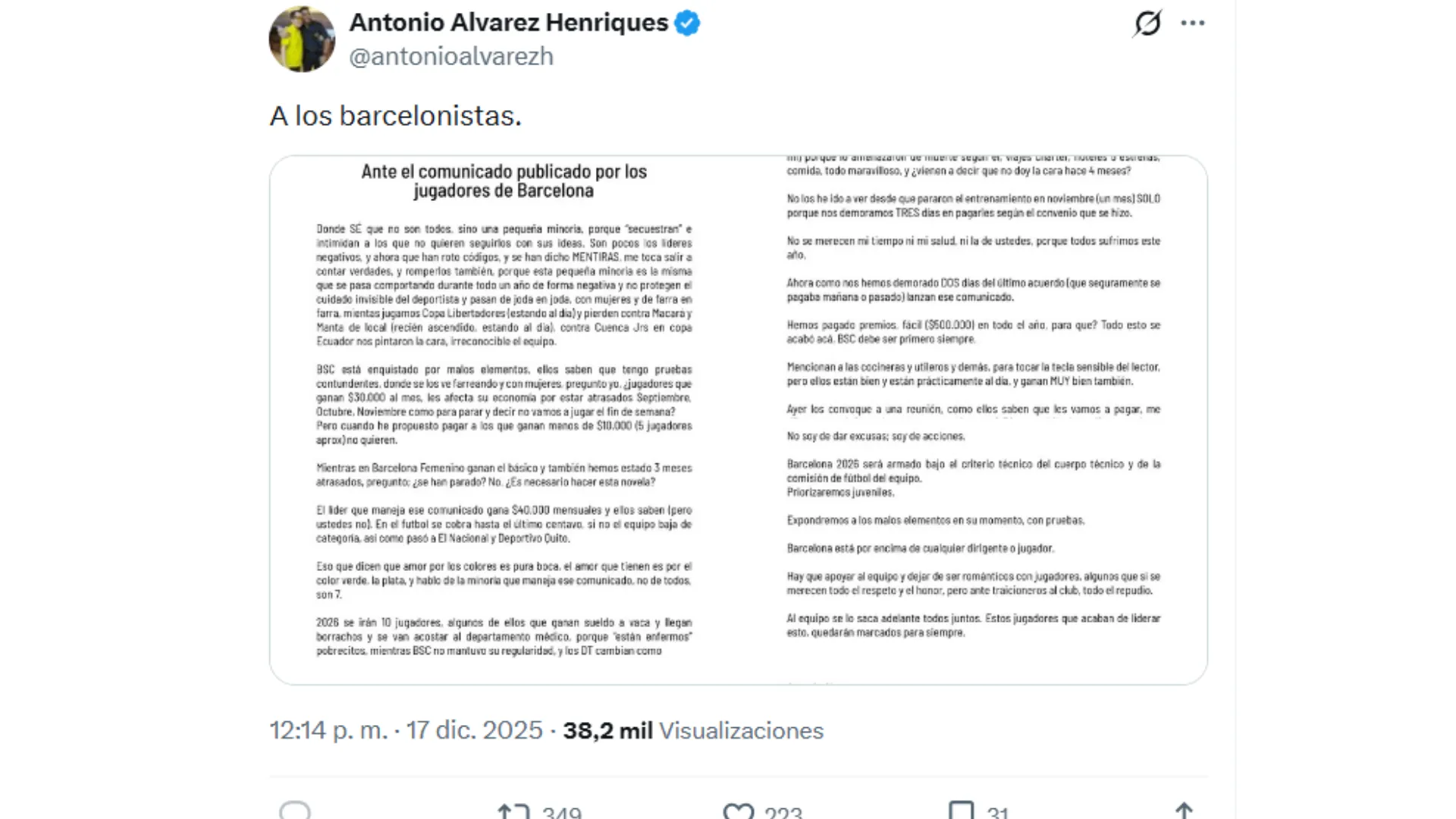 Mediante un comunicado en sus redes sociales Antonio Álvarez expuso a los jugadores de Barcelona SC con estas palabras: “BSC está enquistado por malos elementos, ellos saben que tengo pruebas contundentes, donde se los ve farreando y con mujeres, pregunto yo, ¿jugadores que ganan $30.000 al mes, les afecta su economía por estar atrasados Septiembre, Octubre, Noviembre como para parar y decir no vamos a jugar el fin de semana? Pero cuando he propuesto pagar a los que ganan menos de $10.000 (5 jugadores aprox) no quieren.”, avisó el presidente.