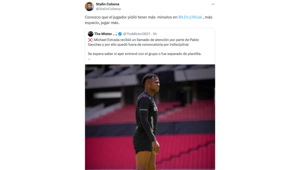 Este llamado de atención respondería a que el jugador le habría solicitado al DT jugar más, tener más minutos e importancia en el club, según la información de Stalin Cobeña. Estrada venía siendo de lo mejor en ataque para Liga de Quito en esta temporada.