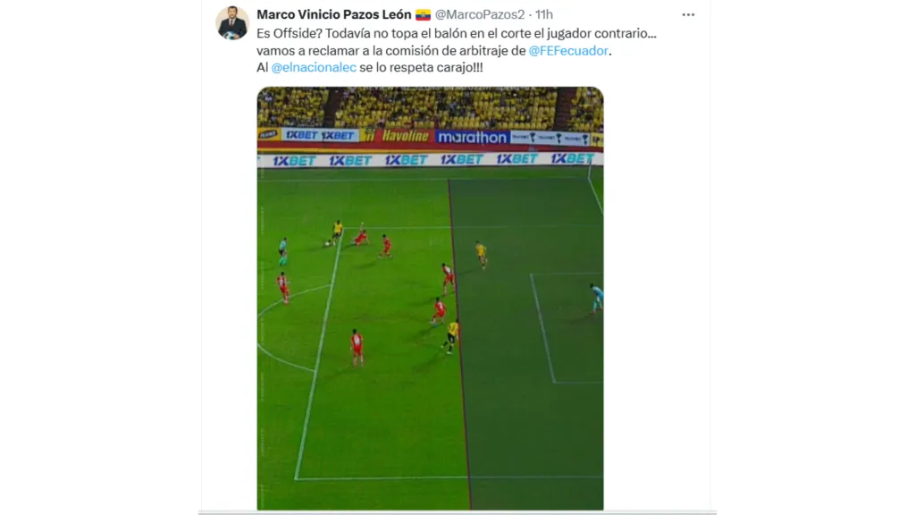 Asimismo, Marco Pazos recalcó que El Nacional reclamará este gol y partido en la Comisión de Arbitraje de la Federación Ecuatoriana de Fútbol. El directivo también terminó su mensaje con la frase: “A El Nacional se lo respeta carajo”. El partido terminó 1 a 0.