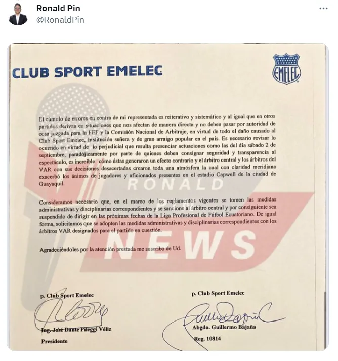 Ronald Pin confirmó en sus redes sociales que Emelec ha pedido una sanción para el central Franklin Congo por su accionar en el partido contra Aucas y también para los jueces del VAR.