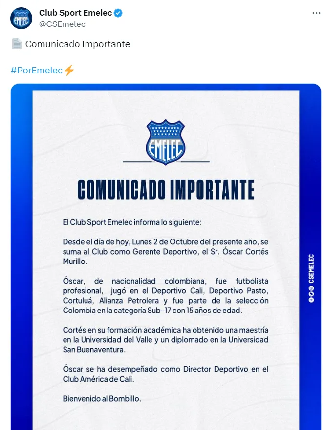 Mediante sus redes sociales, Emelec ha confirmado que su nuevo Gerente Deportivo es el Sr. Óscar Cortés Murillo, colombiano que se destacó como futbolista en varios equipos de su país.