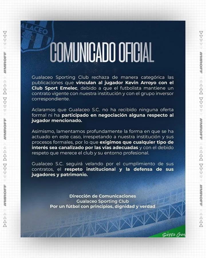 De esta forma el cuadro azuayo de la LigaPro Serie B señala que Arroyo sigue siendo jugador de Gualaceo. Emelec no ha respondido el comunicado del equipo.
