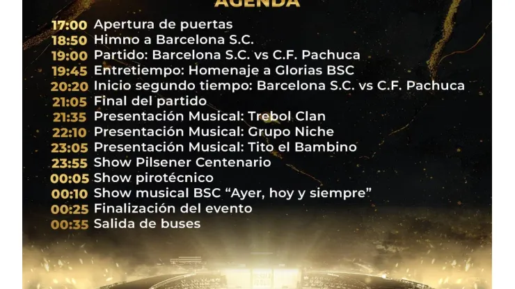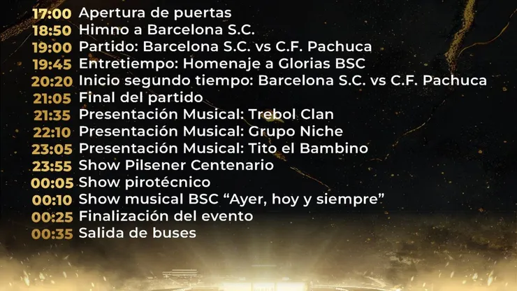 La agenda de la Noche Centenario para Barcelona SC es la siguiente: