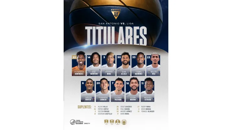 Así forma Liga de Quito para este partido: Domínguez, Quintero, Mina, Allala, Quiñónez, Díaz, Gruezo, Cornejo, Pastrán, Medina, Estrada.