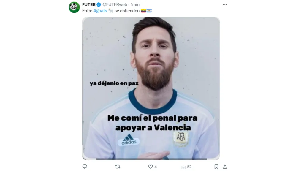 La Selección de Ecuador se mandó un partidazo en la Copa América 2024 contra Argentina, sin embargo, no le alcanzó para quedarse con vida y cayó en los penales. La buena actuación de Ecuador y el gran fallo de Enner Valencia, quien erró un penal, fueron los protagonistas de los memes de la jornada.
