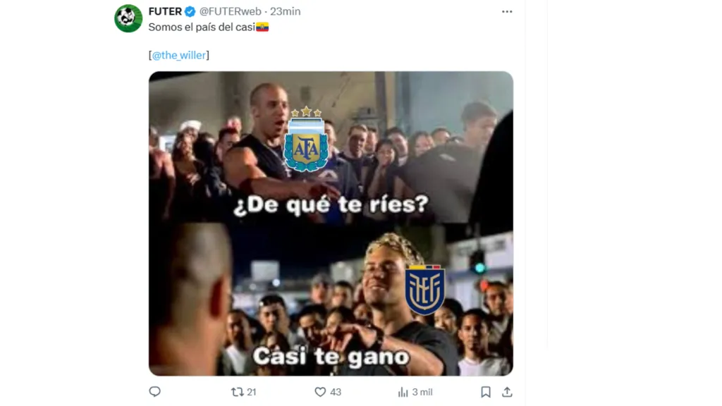 La reacción de los hinchas de Ecuador tras perder en los penales ante los campeones del mundo, también fue motivo de meme. Algunos hinchas muy orgullosos mostraban la camiseta de Ecuador, mientras que otros simplemente rompieron en llanto.