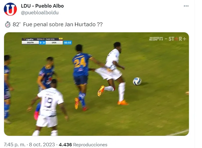 En Liga de Quito todos los jugadores y cuerpo técnico pidieron sobre el final un penal para los ‘Albos’. Jan Hurtado cayó en el área y en las repeticiones se observa un que estiran su pantaloneta.