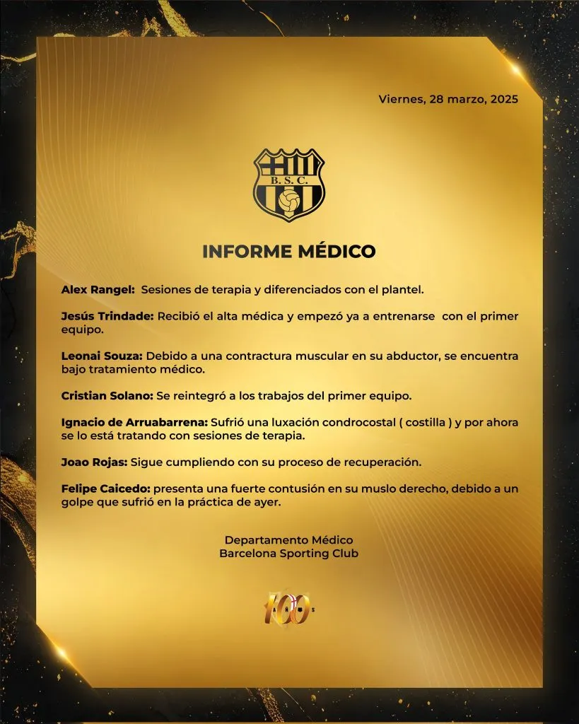 Barcelona SC confirmó en su informe de lesiones que Felipe Caicedo es baja por una fuerte contusión en su muslo derecho. El jugador sufrió esta molestia en la práctica de ayer y esto impidió que se pierda el partido ante Delfín y no llegue ni al banco de suplentes.
