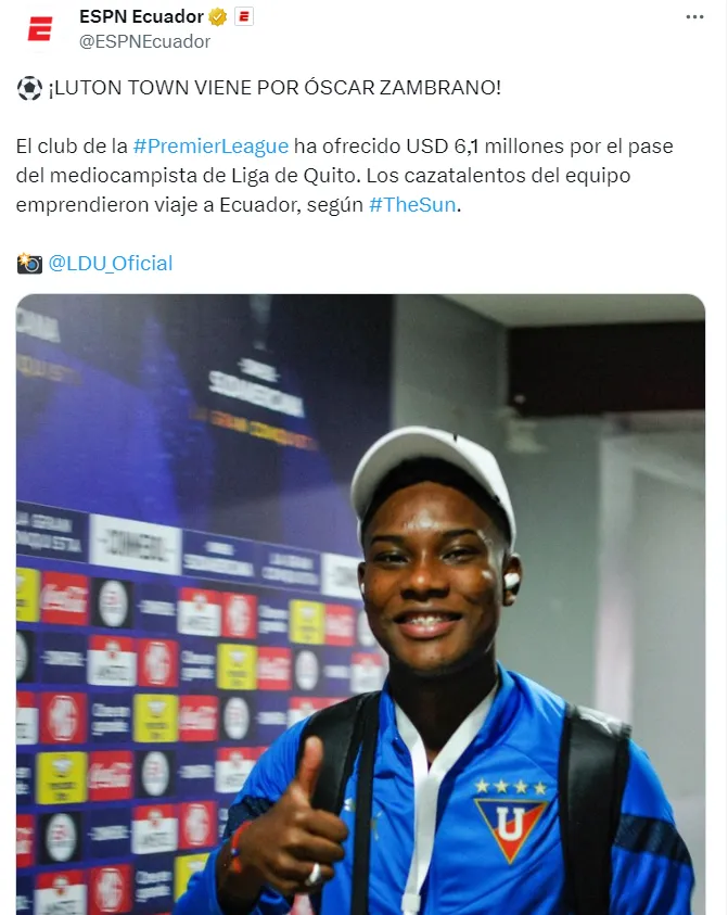 Luton Town estaría muy interesado en hacerse con los servicios de Óscar Zambrano, para lo cual le van a ofrecer a Liga de Quito más de USD 5 millones de dolares, 6.1 millones aproximademente.