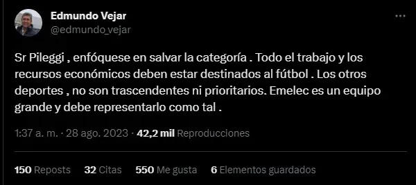 “Señor Pileggi, enfóquese en salvar la categoría. Todo el trabajo y los recursos económicos deben estar destinados al fútbol. Los otros deportes no son trascendentes ni prioritarios. Emelec es un equipo grande y debe representarlo como tal”, aseguró Vejar.
