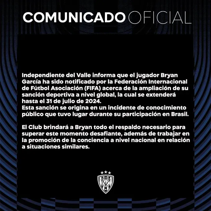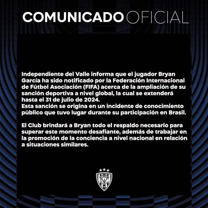 Mediante sus redes sociales oficiales, Independiente del Valle dio a conocer que el ente regulador del fútbol mundial les ha notificado que la sanción a Bryan García se extiende a nivel global, es decir no podrá competir en ningún torneo oficial. En princpio la sanción se extendía solamente a torneos de Brasil, donde ocurrió el hecho.