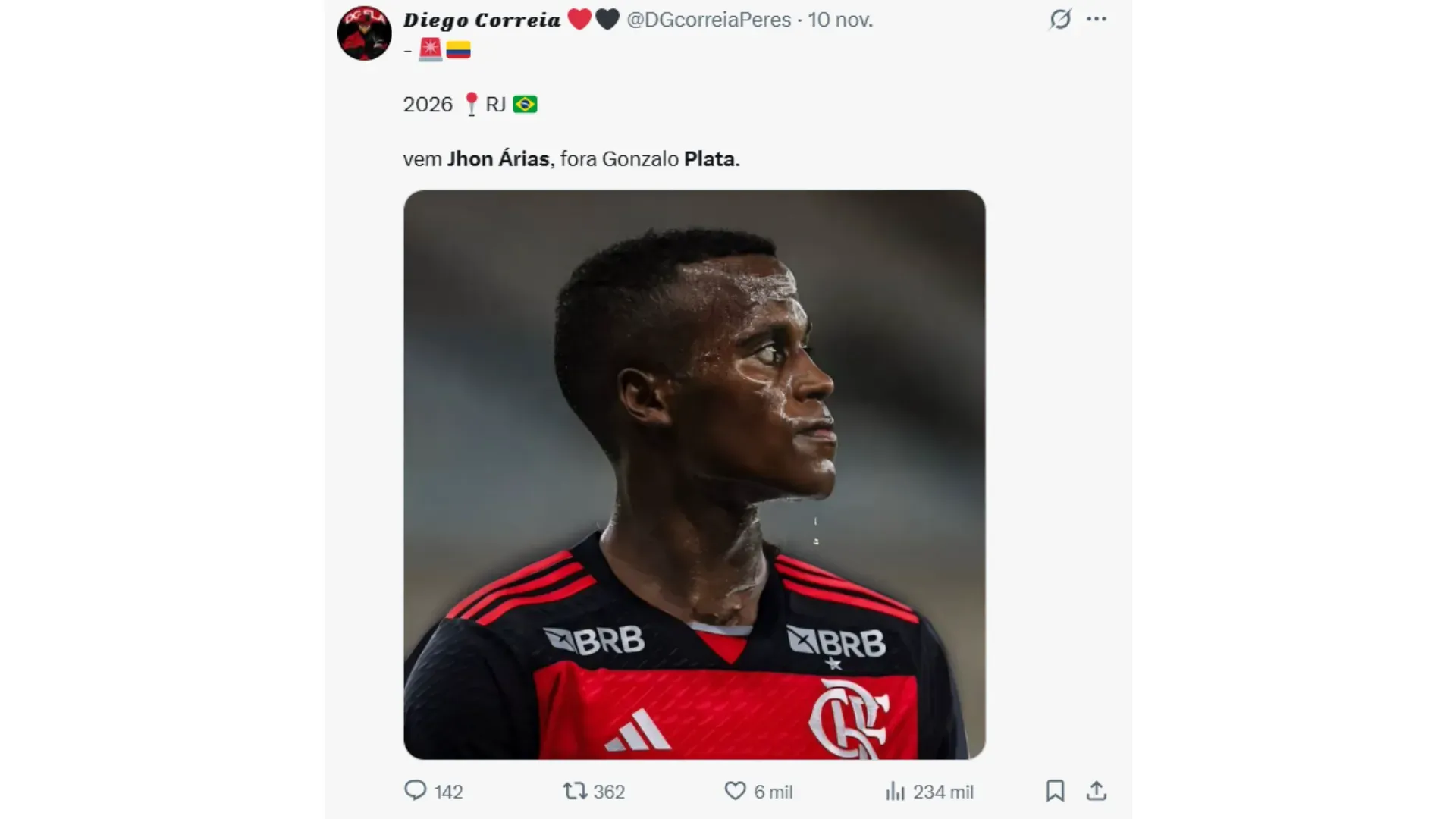 En redes sociales se ha viralizado el pedido de varios hinchas de Flamengo que han pedido a Jhon Arias como el jugador que debe reemplazar a Gonzalo Plata, ante una eventual salida del ecuatoriano. Algunos están a favor y otros no quieren su fichaje, por su pasado en Fluminense.