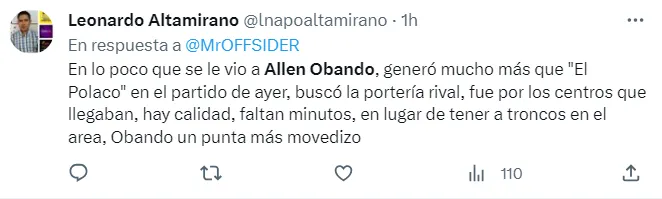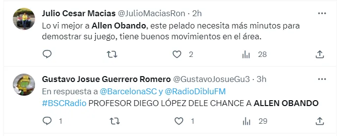En redes sociales muchos aficionados de Barcelona SC también aprovecharon la oportunidades para pedir que Diego López le dé más minutos al joven delantero, Allen Obando.