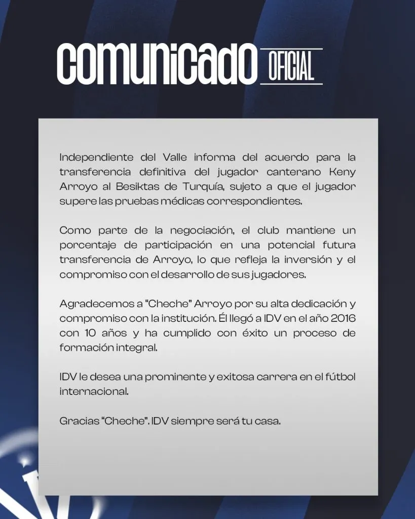 Mediante un comunicado en sus redes sociales, Independiente del Valle confirma que Keny Arroyo se va a jugar en el Besiktas de Turquía. El joven jugador tricolor ya se mudará en este mismo mercado, porque en el país europeo aún no cierra su ventana de transferencias hasta el próximo 11 de febrero.