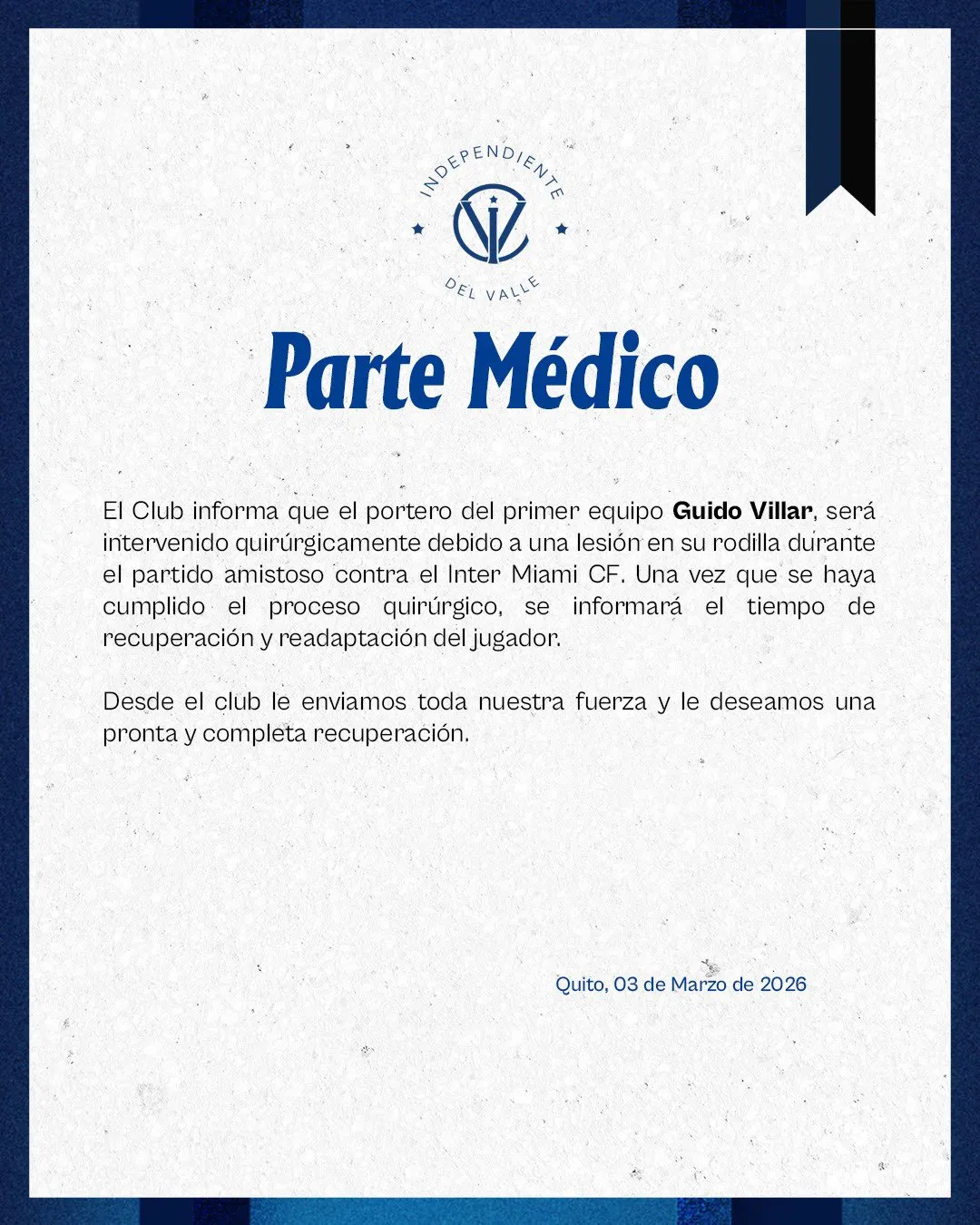 En sus cuentas oficiales, IDV confirmó que Villar será sometido a una operación: “Guido Villar, será intervenido quirúrgicamente debido a una lesión en su rodilla durante el partido amistoso contra el Inter Miami CF. Una vez que se haya cumplido el proceso quirúrgico, se informará el tiempo de recuperación y readaptación del jugador”, dice el comunicado de IDV.