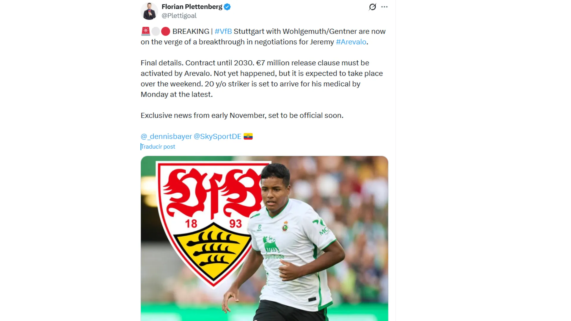 Según reveló Florian Plettenberg, Stuttgart está muy adelantado en el fichaje de Jeremy Arévalo y ejecutaría la opción de compra en las siguientes horas. Se espera que el ecuatoriano tenga en Alemania un contrato hasta 2030 y un salario superior al millón de euros por temporada.