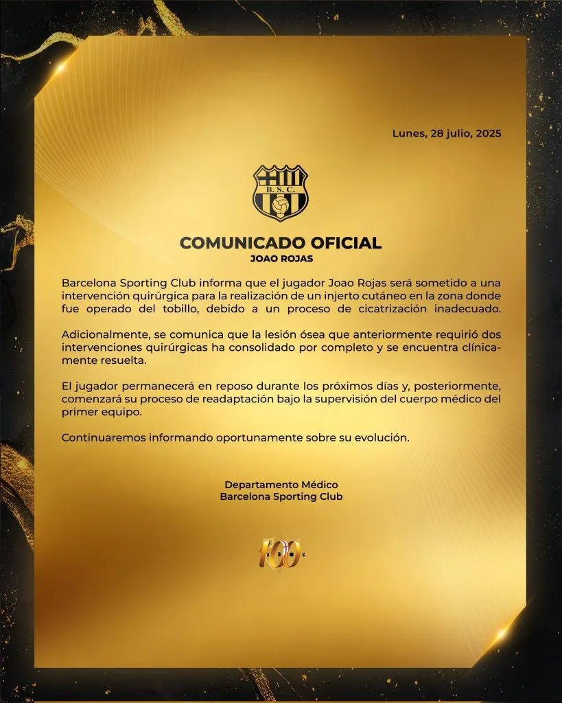 La hinchada de Barcelona SC también se ha molestado en las últimas horas, porque se confirma que Joao Rojas aún no se ha operado. Al jugador le iban a hacer un injerto de piel y esto fue comunicado hace varias semanas, no obstante, aún no se hace el procedimiento.