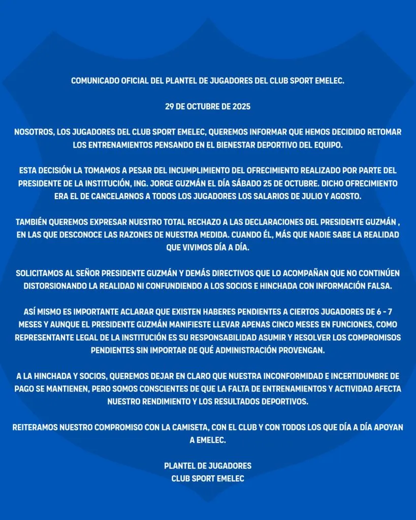 - Los jugadores de Emelec emitieron un comunicado rechazando dichos del presidente sobre los meses de deuda.
