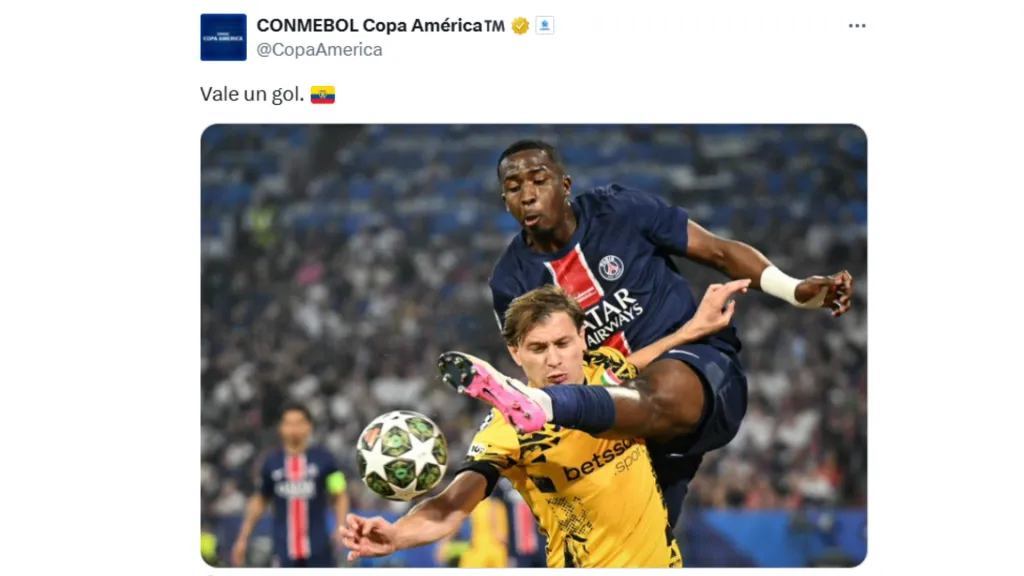 La Conmebol no fue ajena a la gran jugada de William Pacho y reaccionó al ecuatoriano. “Vale un gol”, se escribió desde la cuenta de la Conmebol para la Copa América. Pacho está a 45 minutos de coronarse campeón de la Champions League y ser el primer ecuatoriano en levantar la orejona.