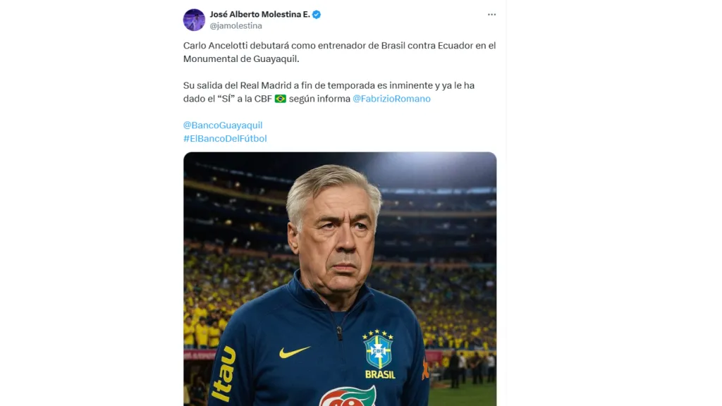 Carlo Ancelotti será el nuevo entrenador de Brasil y debutará contra Ecuador en las Eliminatorias. En la Selección de Ecuador existía duda de dónde jugar este partido y finalmente ya se tendría claro en qué localidad y en qué estadio se debe jugar el debut del DT italiano.