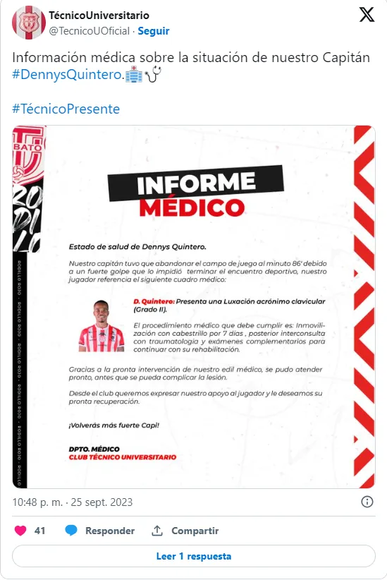 Específicamente, Quintero sufre de una una luxación acrónimo clavicular (Grado II), por lo que deberá concentrarse en su proceso de rehabilitación para retornar a las canchas. Así, Barcelona SC puede aprovechar el bajón anímico de Técnico Universitario, oncena que no contará con su capitán.