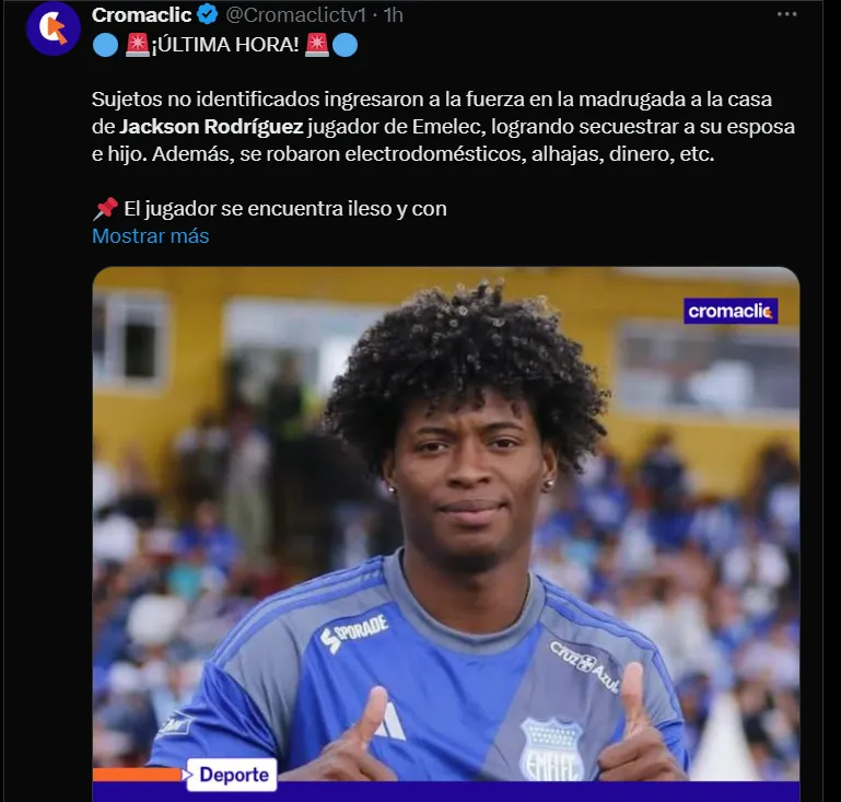 Una lamentable noticia ha golpeado al fútbol ecuatoriano luego de que trascendiera que la familia de Jackson Rodríguez, jugador de Emelec ha sido secuestrada en la madrugada de este miércoles y aún no ha información al respecto.
