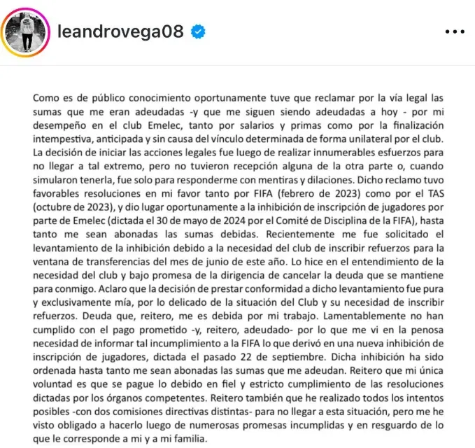 Emelec enfrenta una nueva demanda FIFA que desembocó en una inhabilitación de fichar jugadores para la siguiente temporada por una demanda de Leandro Vega. En medio de versiones, el propio defensor argentino decidió romper el silencio sobre el tema.