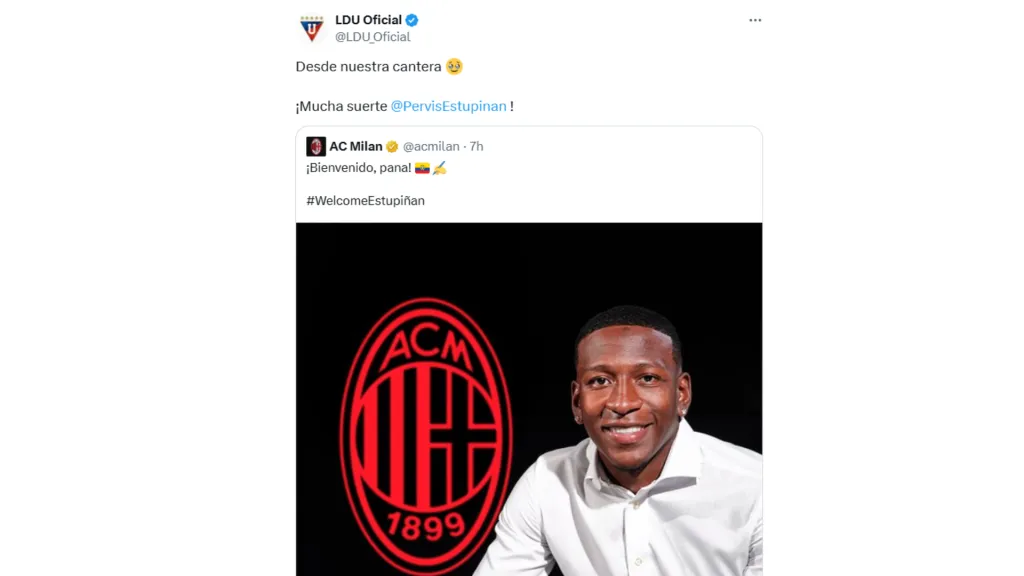 Este jueves 24 de julio de 2025, Pervis Estupiñán fue presentado como nuevo jugador de AC Milan, generando un gran número de reacciones en Ecuador, una de las que más llamó la atención, la de Liga de Quito. El club fue el primer equipo que le abrió las puertas al lateral.