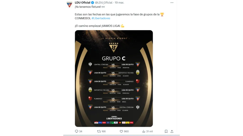 El partido entre Liga de Quito y Barcelona SC está programado para el 6 de abril de 2025 en el estadio Rodrigo Paz Delgado. Sin embargo, en medio de la semana los amarillos estarían jugando contra Independiente del Valle en Guayaquil, mientras que Liga estará en Argentina enfrentando a Central Córdoba.