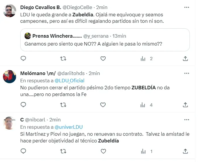 Mediante las redes sociales, los hinchas de Liga de Quito arremetieron contra Luis Zubeldía culpándolo de que los blancos no hayan goleado y vayan a Brasil con apenas 1 gol de ventaja.