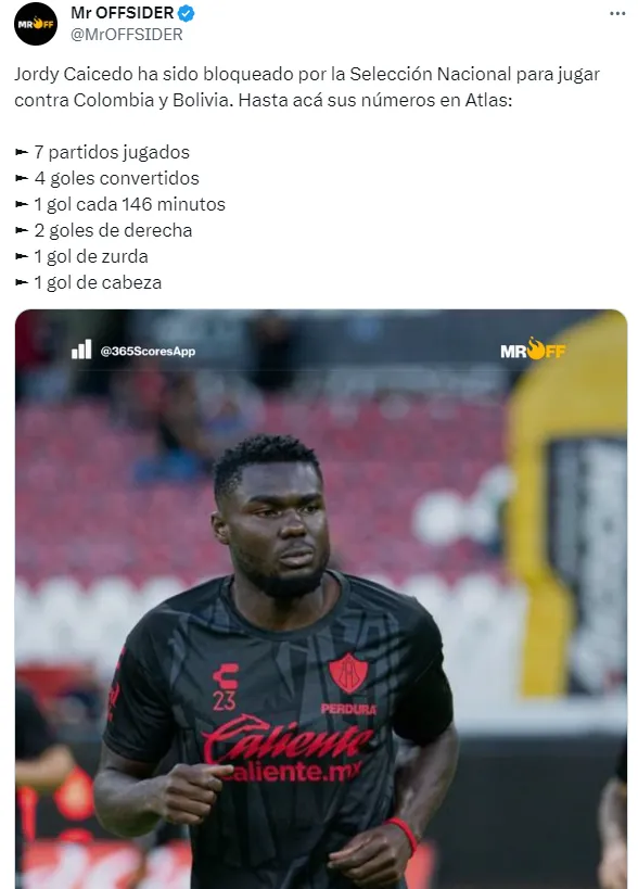 Según informó Mr. OFFSIDER, la Selección de Ecuador finalmente ha bloqueado para la próxima doble fecha de Eliminatorias al delantero tricolor que milita en Atlas, Jordy Caicedo.