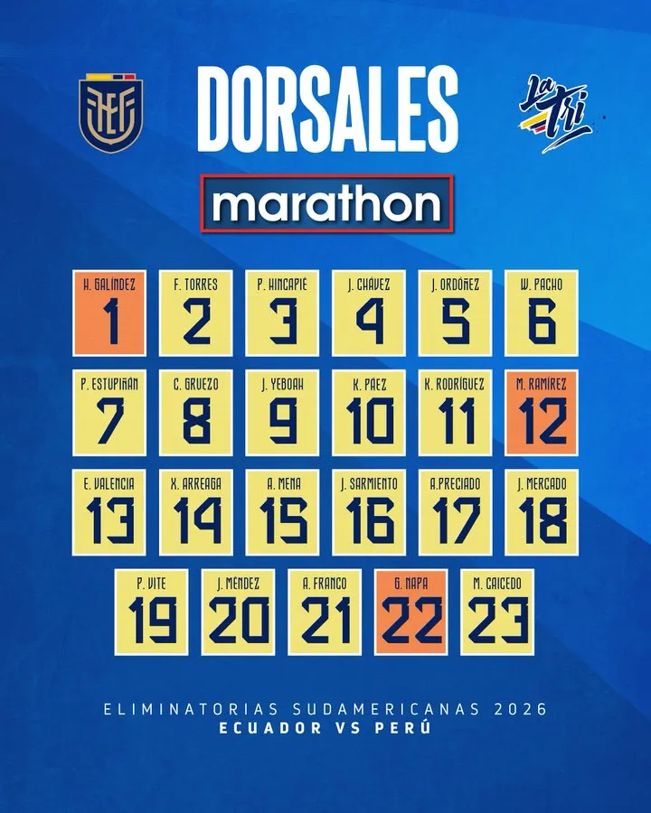 En la confirmación de dorsales de la Selección de Ecuador también se reveló los jugadores que no estarán ante Perú. El DT decidió no contar con: Janner Corozo, Obando, Villa, Joel Ordóñez, Patrickson Delgado, Nilson Angulo y Anthony Valencia.