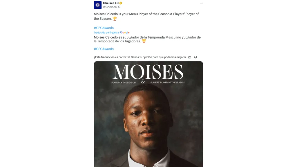 Chelsea confirmó en sus redes sociales que Moisés Caicedo fue elegido como el mejor jugador masculino del equipo en este año. Pero también ganó el premio al mejor jugador de los jugadores de este año. Es decir, también sus mismos compañeros lo eligieron como el mejor.