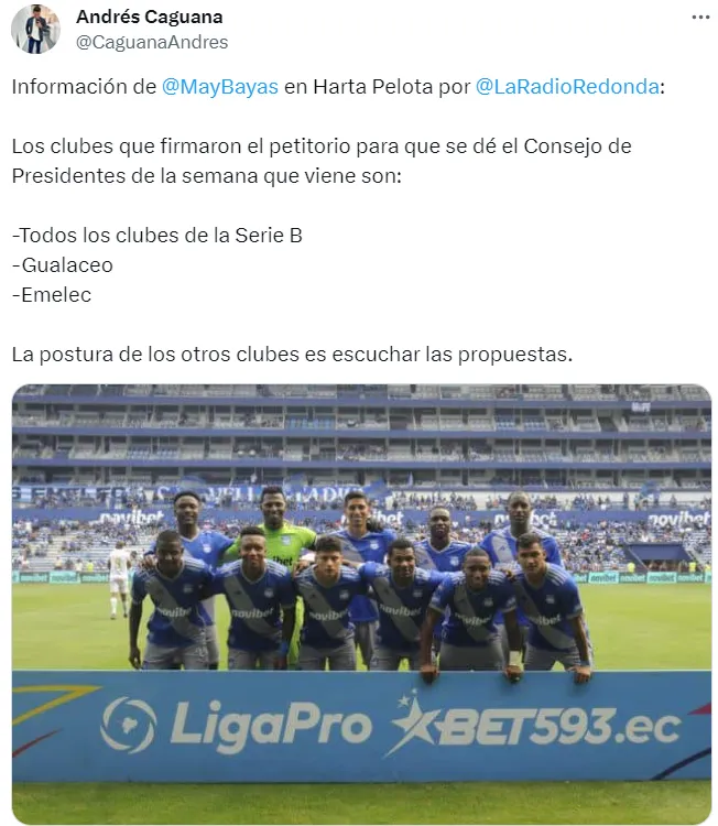 Según informó Mayra Bayas en la Radio Redonda, la postura de Emelec respesto a una posible propuesta de no descenso sería favorable y por eso apoyan el consejo de presidentes de la LigaPro.