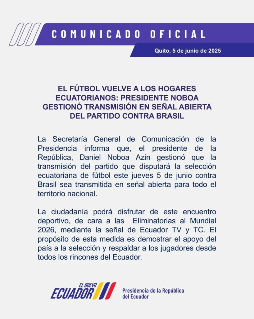 Mediante un comunicado oficial, el Gobierno de Ecuador notificó que el partido de Ecuador vs Brasil se verá por señal abierta. El propósito, según el Gobierno, es que todo el país pueda apoyar a los jugadores en este encuentro que puede significar el paso al mundial de 2026:
