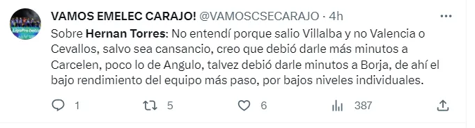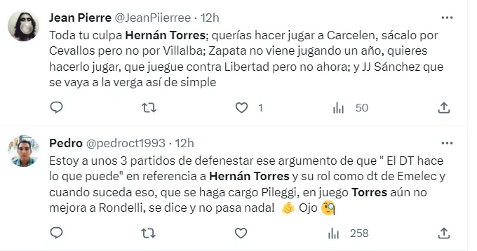 Emelec estaba ganando un importante partido, pero al minuto 85′ se lo empataron y al 90′ se lo ganaron. El DT, Hernán Torres, se mostró preocupado con el equipo, pero también fue muy criticado por los aficionados.