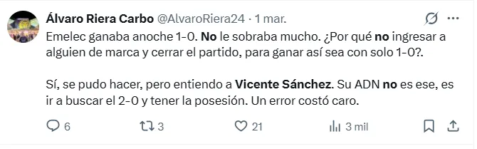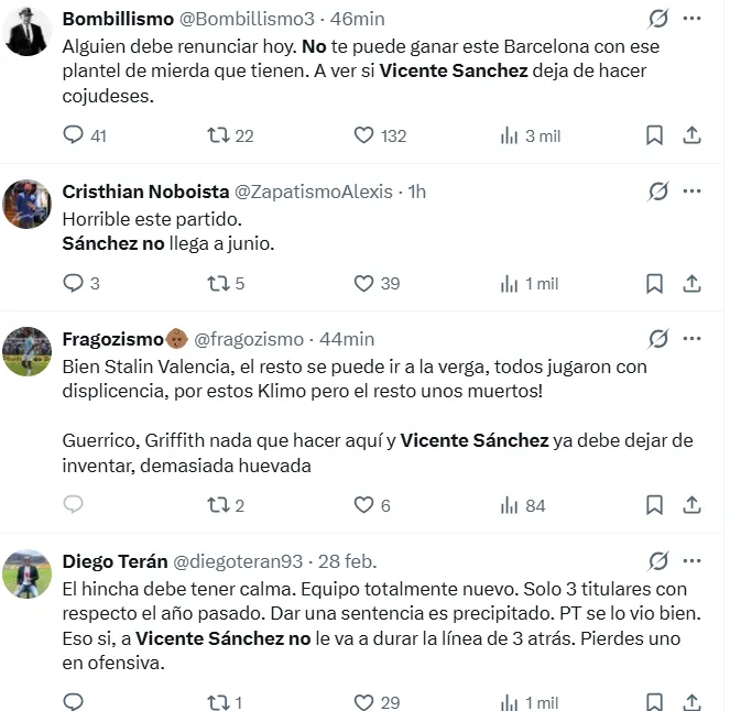 Ante este resultado, los hinchas cuestionaron al DT: “Pero Vicente Sánchez está verde también, hasta más que sus dirigidos, está recién conociendo el fútbol ecuatoriano y su plantel“. “A ver si Vicente Sánchez deja de hacer cojudeses“. “Vicente Sánchez ya debe dejar de inventar”, fueron algunos comentarios.