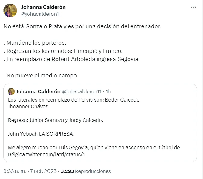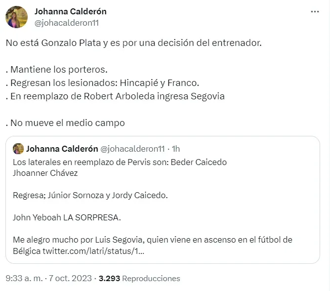 Según reveló Johanna Calderón en sus redes sociales, Gonzalo Plata se terminó quedando fuera de la lista de Ecuador por una decisión del entrenador, Félix Sánchez.