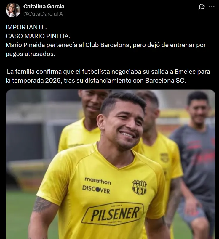 Según la periodista Catalina García de Teleamazonas, la familia de Pineida confirmó que Emelec negociaba al jugador ecuatoriano para el 2026. Pineida quería salir por los meses impagos en los amarillos.