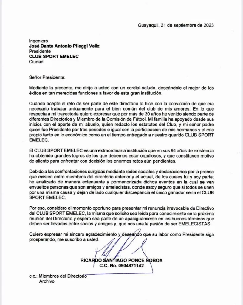 “Debido a las confrontaciones surgidas mediante redes sociales y declaraciones por la prensa que existen entre miembros del directorio anterior y el actual, de los cuales fui y soy parte; he analizado de manera extenuante y pormenorizada dichos eventos en la cual se ven envueltos personas que son amigos y emelecistas, donde estoy seguro que si todos se unen por una misma causa y dejan de lado cualquier discrepancia el único ganador sería el Club Sport Emelec”, asegura parte de sus palabras expresadas en la carta de dimisión.