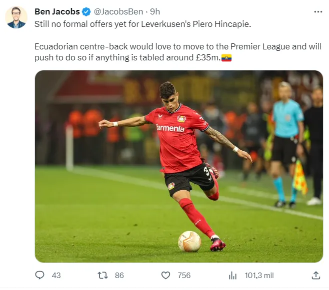 El otro gran interesado en Piero Hincapié para esta nueva temporada sería el equipo de Londres, West Ham United, según confirmó Ben Jacobs. El ecuatoriano y el Leverkusen esperan una oferta formal.