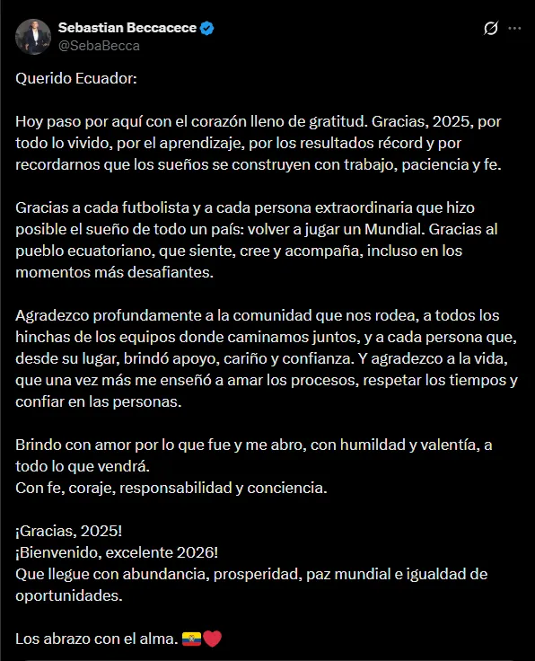 Sebastián Beccacece volvió a ser noticia este miércoles y es que a falta de seis meses para la disputa de la Copa del Mundo 2026 con la Selección de Ecuador, el DT argentino asustó a más de uno. El entrenador colgó un mensaje en redes sociales y se hizo viral.